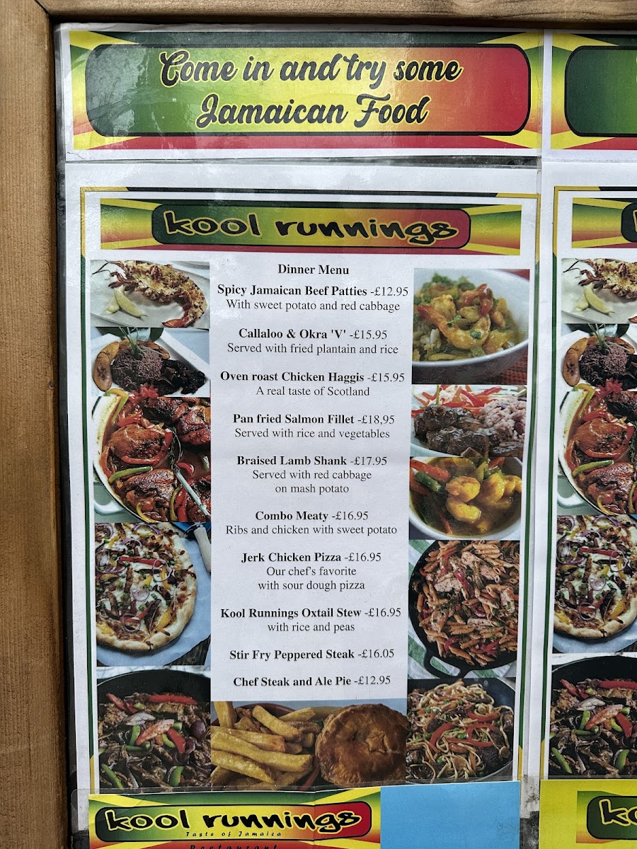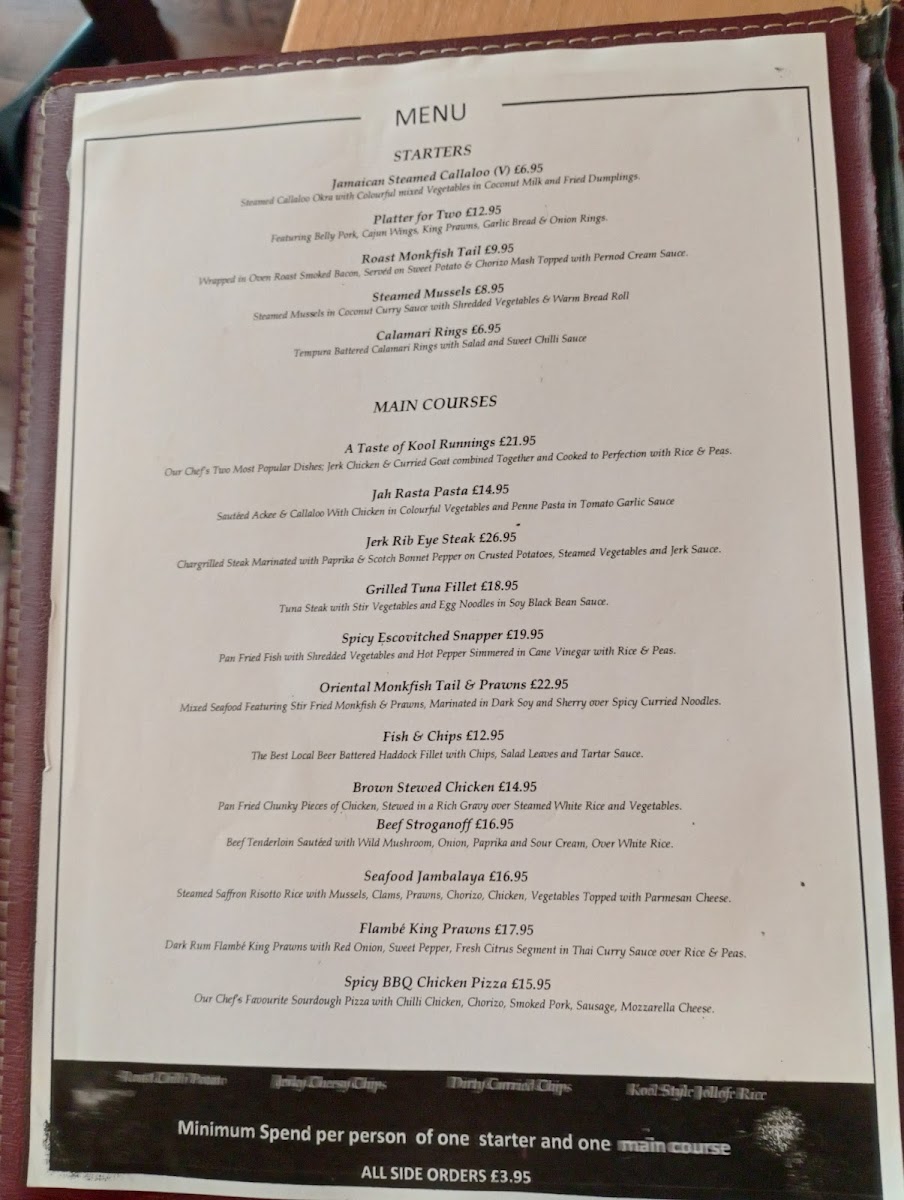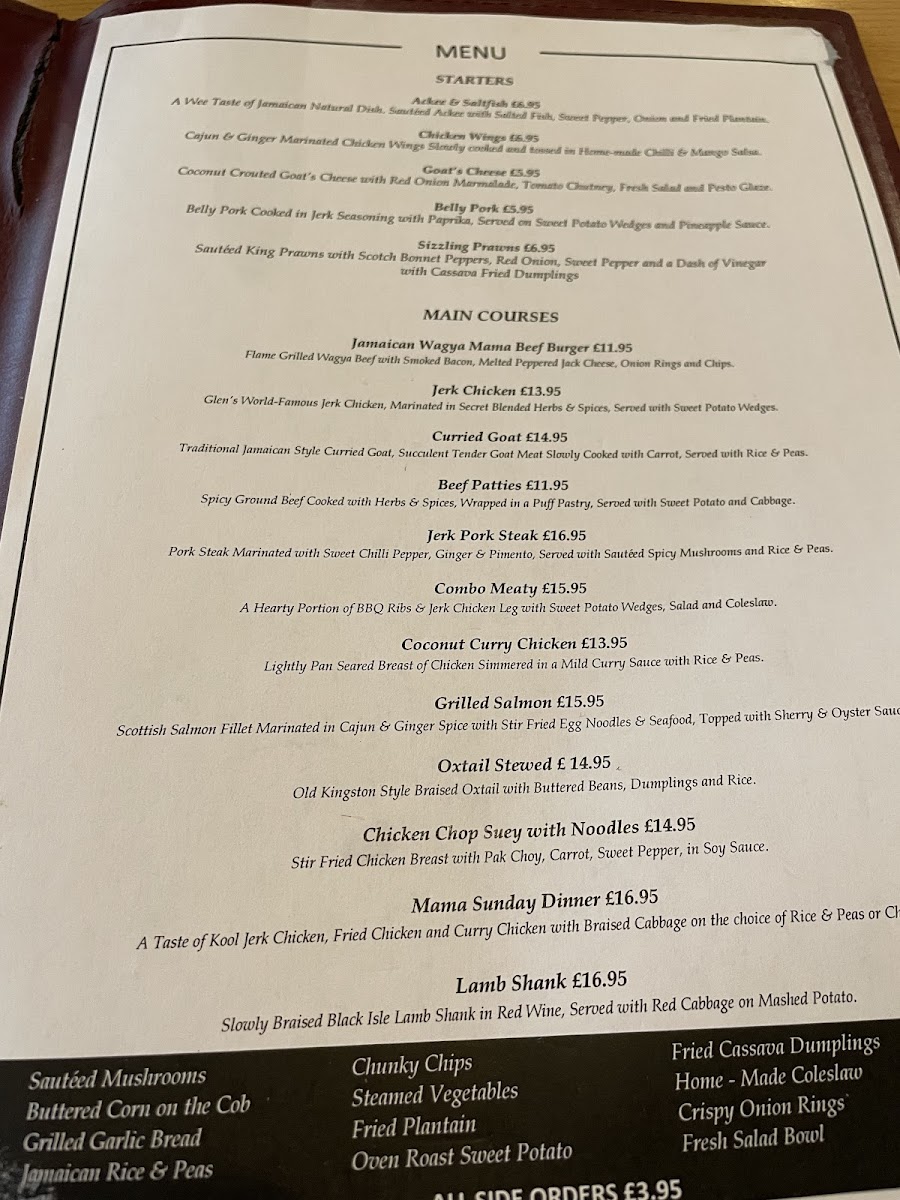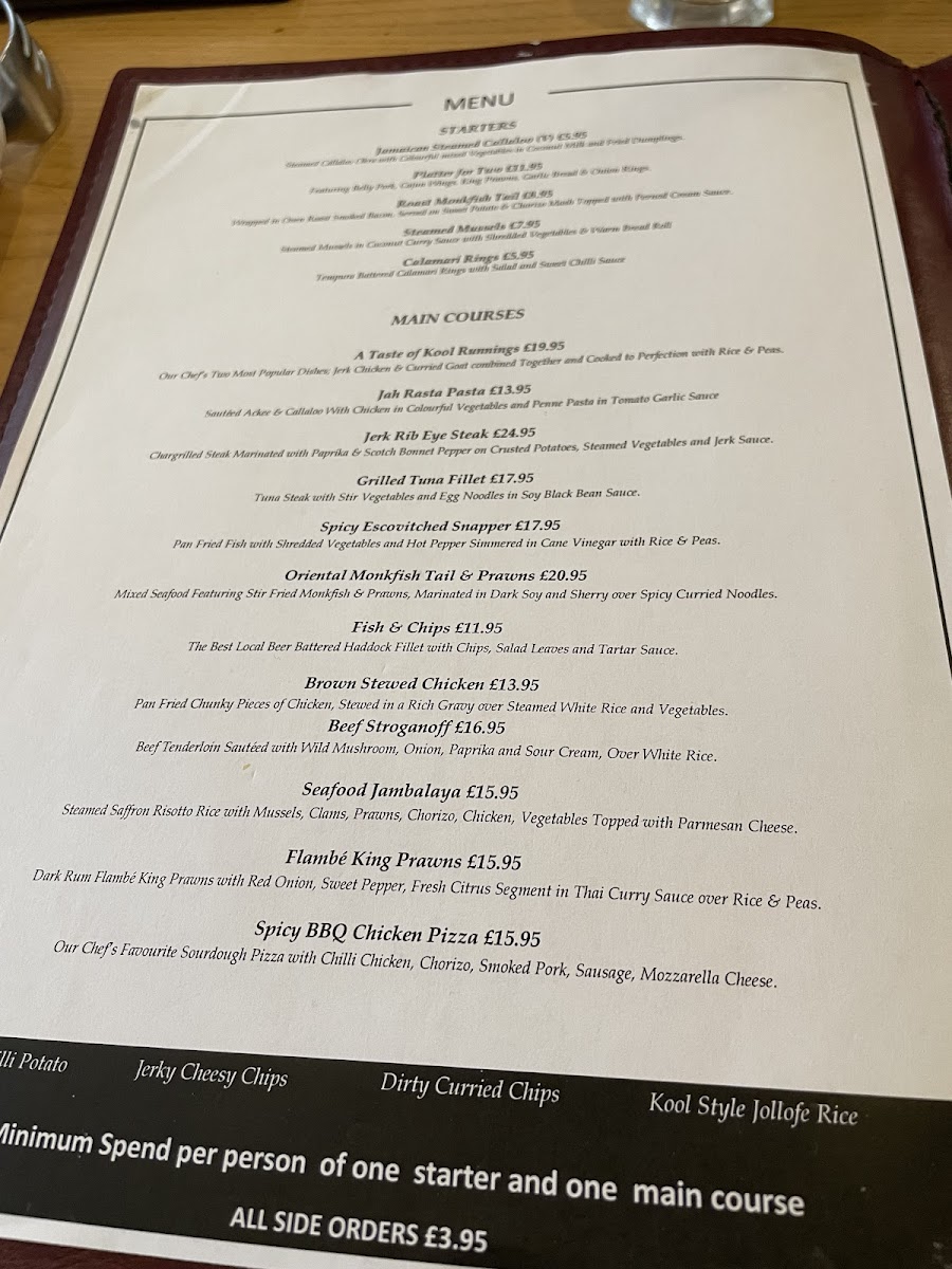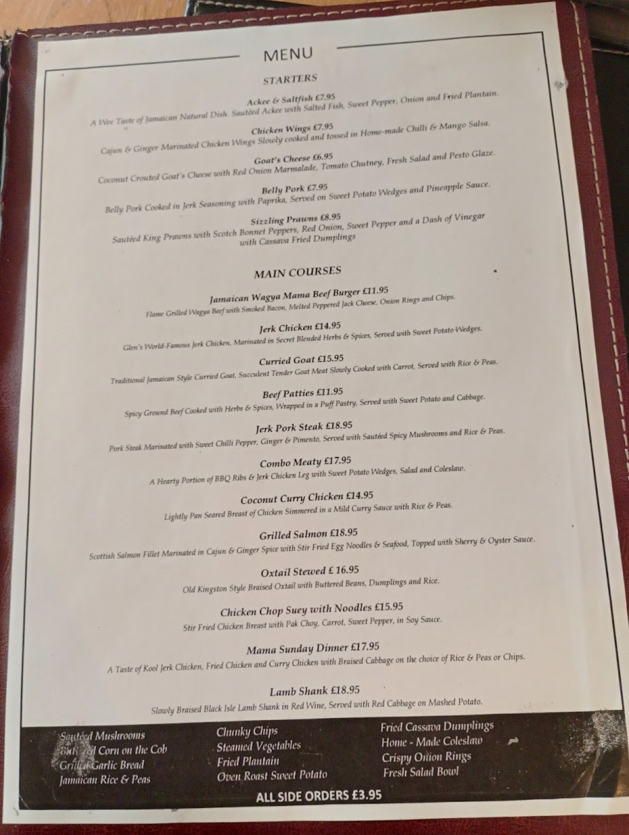 Ackee and salt fish, Fried Plantain, Spicy beef patties, Steamed callaloo and Okro, Escoveitched fish, Jerk pork belly, BBQ ribs, Cajun wings, Sweet potato wedges, Jerk Chicken, Curried Goat, Jerk sauce, Chips.