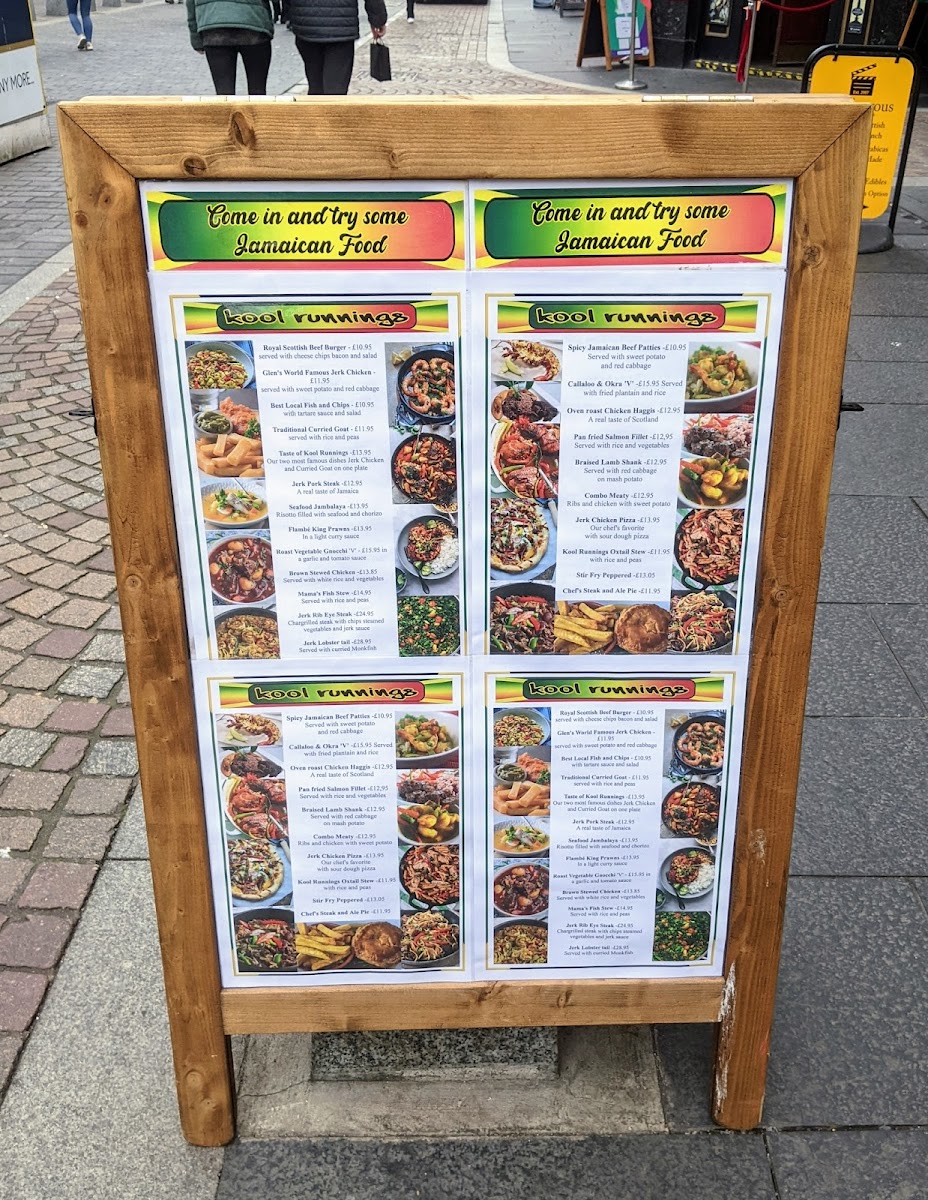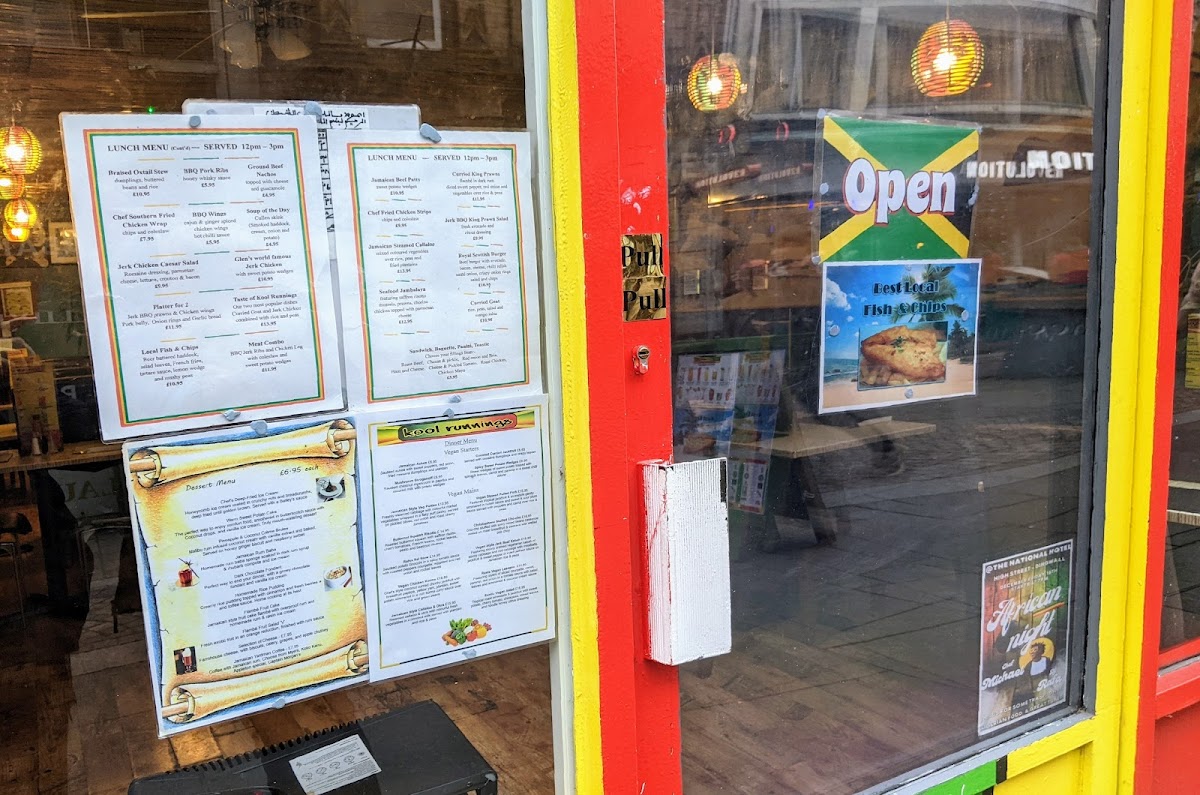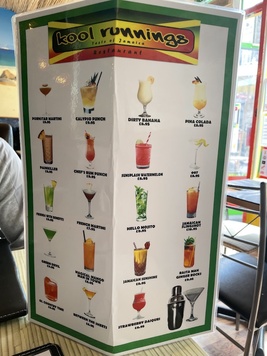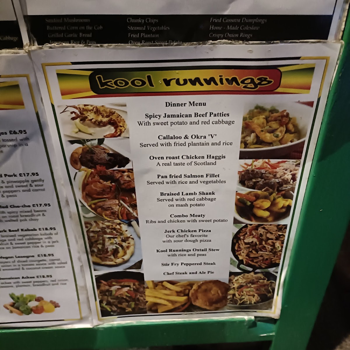 Ackee and salt fish, Fried Plantain, Spicy beef patties, Steamed callaloo and Okro, Escoveitched fish, Jerk pork belly, BBQ ribs, Cajun wings, Sweet potato wedges, Jerk Chicken, Curried Goat, Jerk sauce, Chips.